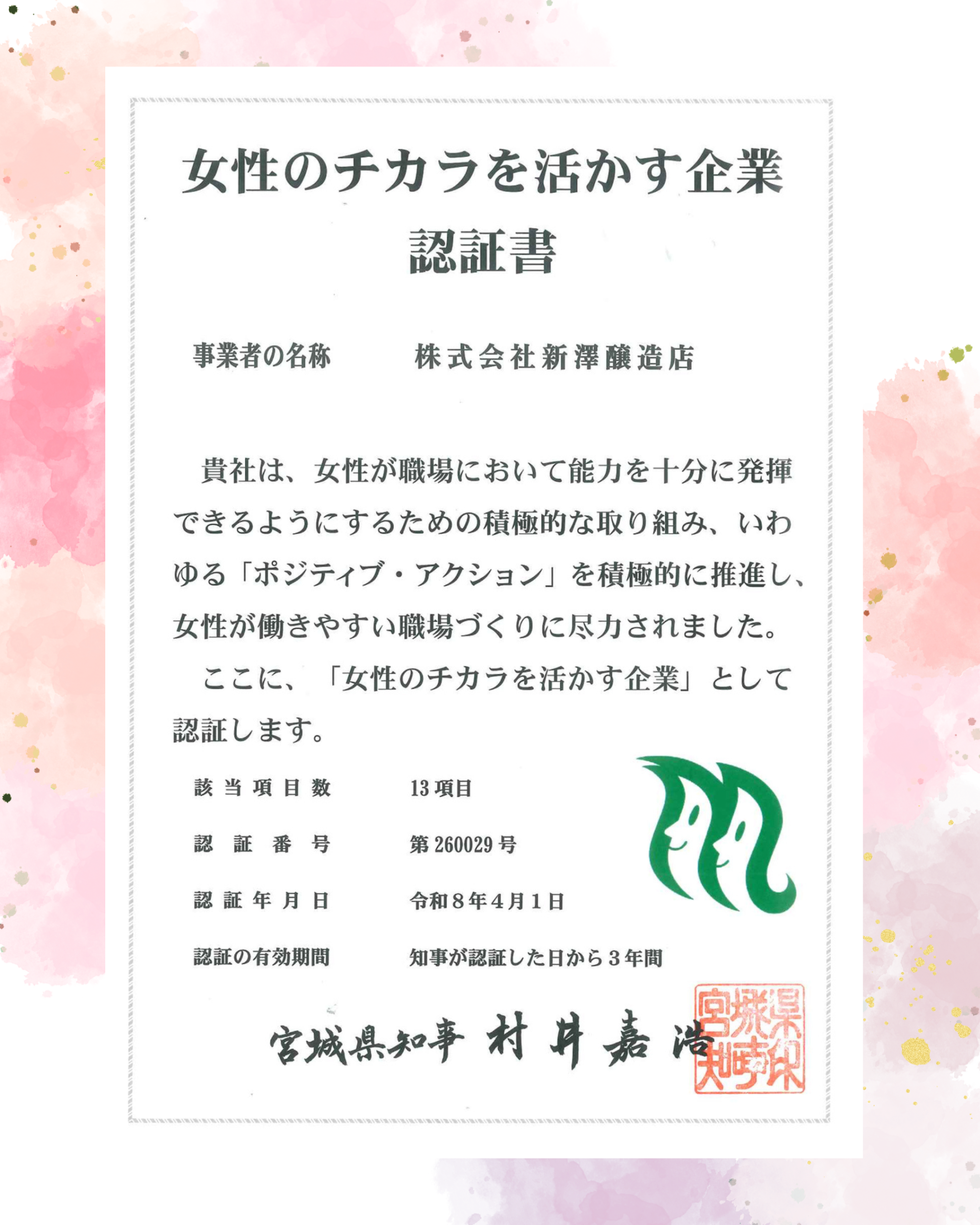 宮城県「女性のチカラを活かす企業」に認証されました。
